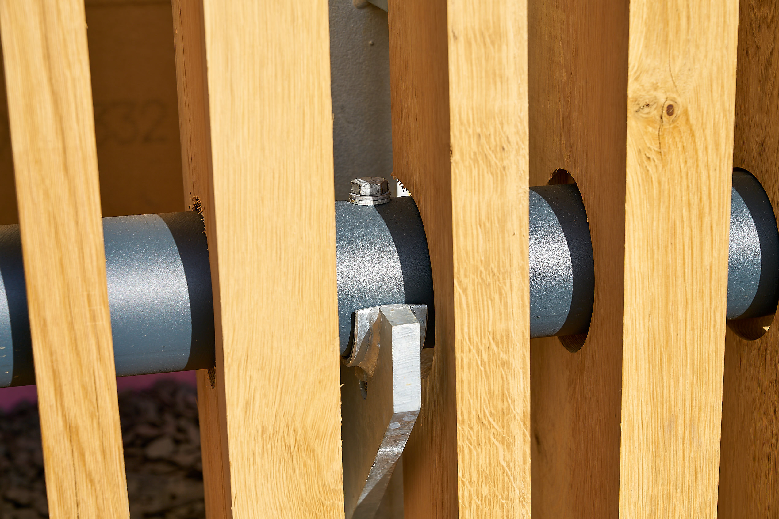 Die Lasten der vertikalen Hauptstruktur möglichst dezent in Richtung lastabtragender Stützen abzuleiten und dabei die Montierbarkeit nicht unnötig kompliziert zu machen war der initiierende Gedanke für die Evolution des „Prinzip Kleiderstange“ genannten Systems. Die Eichenbohlen auf ein rundes Stahlrohr aufgefädelt und fixiert konnten so als einzelne Elemente schnell an die Stützen angehangen und befestigt werden. Diese „Kleiderstangen“ wurden farblich anthrazit abgesetzten und treten hierdurch gegenüber den Eichenkanthölzern optisch in den Hintergrund.