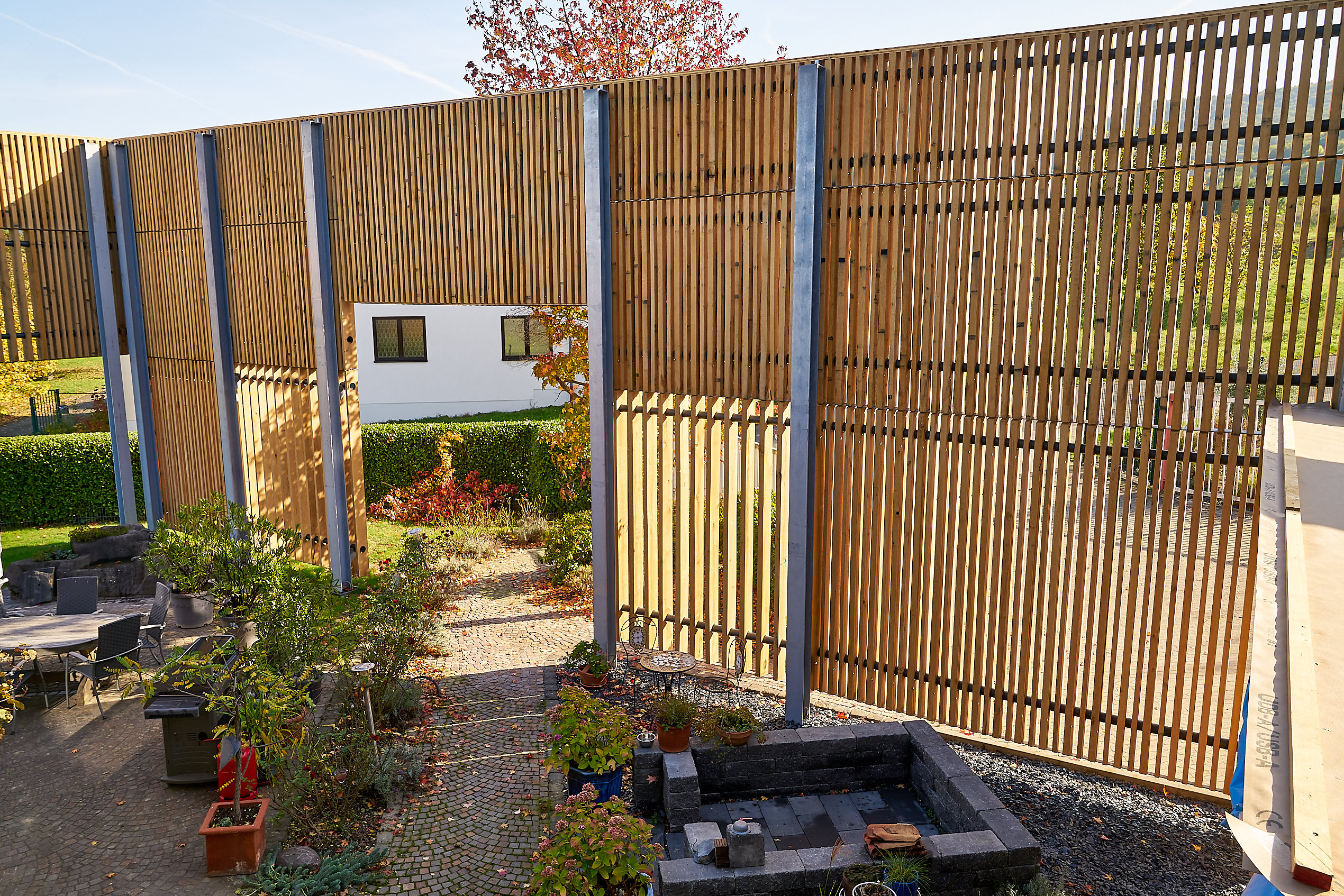 Optische Auflockerungen durch variierende Querschnittsabmessungen und Abstände ermöglichen das Fassadensystem nicht nur zur direkten Bekleidung von Wandelementen zu nutzen sondern diese fort zu führen, um in unbebauten freien Flächen Räume zu schaffen, die variabel lichtdurchflutet und gleichzeitig mehr oder weniger optisch abgetrennt sind und somit Gelände und Räume neu gestalten. Zum Beispiel zur Schaffung von gemütlichen Innenhofsituationen für Winzerbetriebe. Auch der schnelle Austausch einzelner Elemente und ggf. das Anbringen von alternativen Elementen wie Werbeflächen o.ä. sind problemlos möglich.